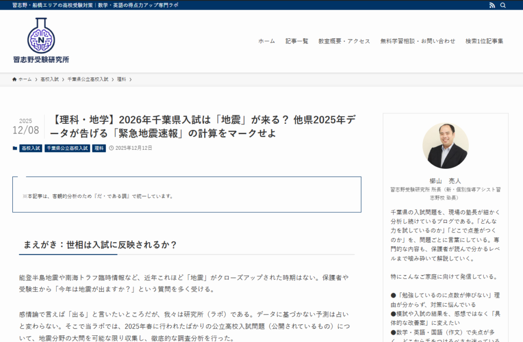 ▶ 【ブログを読む】2026年千葉県入試は「地震」が来る? 他県2025年データが告げる「緊急地震速報」の計算をマークせよ [記事URLを挿入]