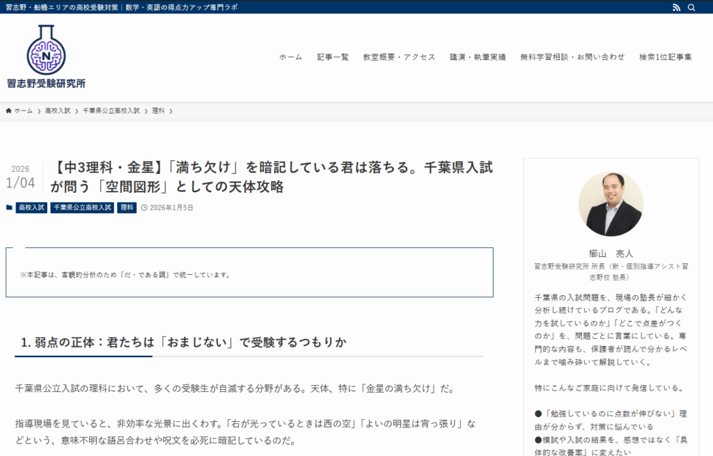 習志野研究所が公開した、千葉県公立高校入試の出題傾向分析記事『「満ち欠け」を暗記している君は落ちる』が、「千葉県公立入試 金星」などの主要キーワードでGoogle検索1位を獲得いたしました。
