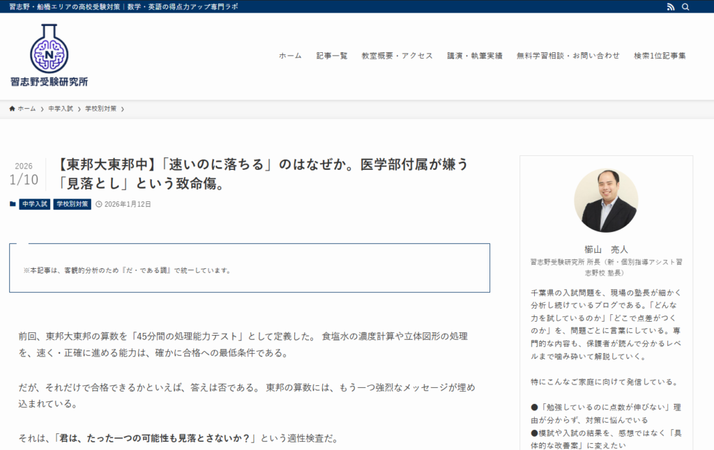 併設している習志野受験研究所の公式ブログにて、新着記事『【東邦大東邦中】「速いのに落ちる」のはなぜか。医学部付属が嫌う「見落とし」という致命傷。』を公開いたしました。