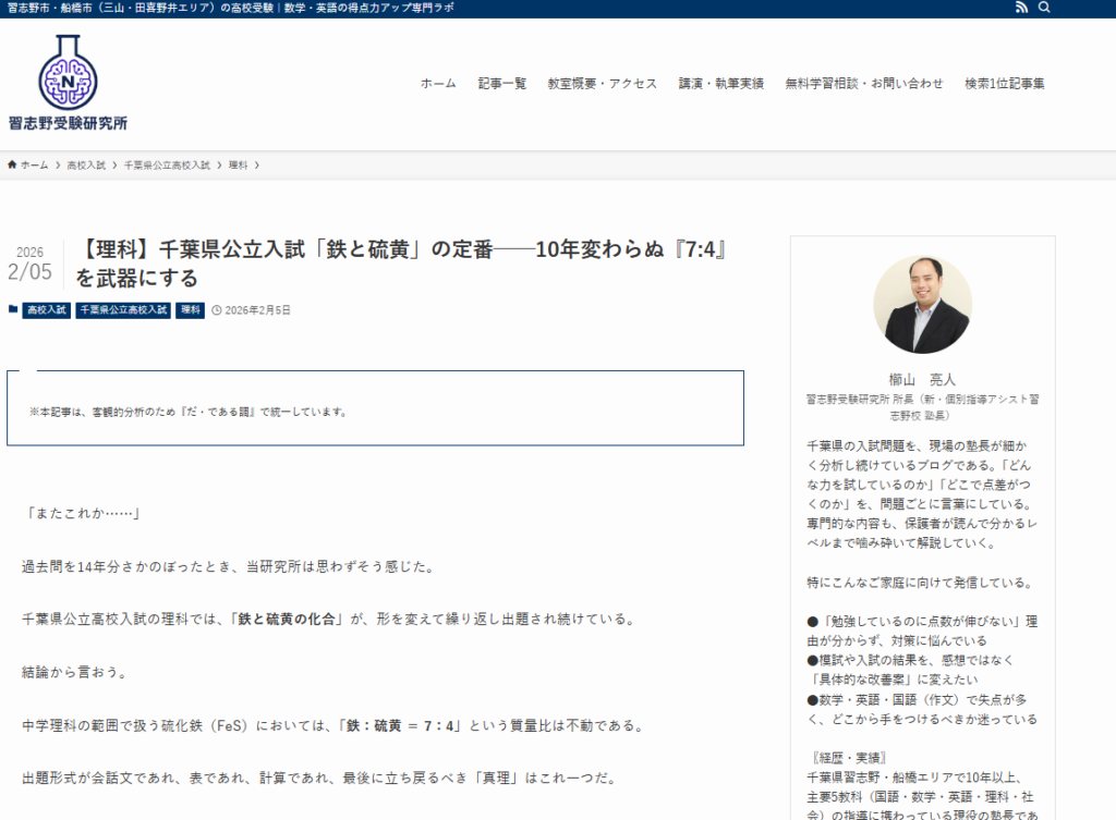 当塾が運営する入試分析機関「習志野受験研究所」の最新記事が、「千葉県公立入試 鉄と硫黄」などの重要キーワードで、Google検索順位1位を獲得いたしました。