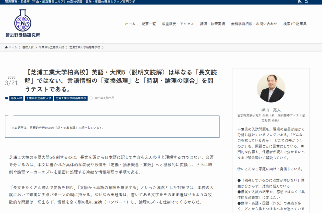 当塾では、志望校の出題傾向を感覚ではなくデータに基づき徹底的に分析し、日々の指導へと落とし込んでいます。昨日、当塾の分析部門(習志野受験研究所)より、「芝浦工業大学柏高校 英語・大問5(説明文読解)」の構造分解データを公開いたしました。