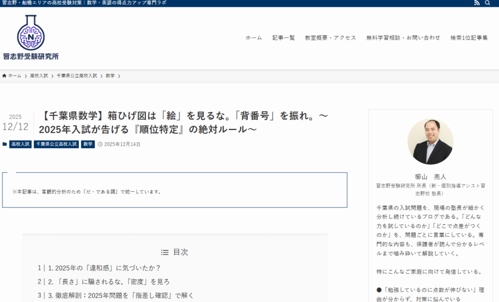 当教室が運営する入試分析ラボ(ブログ)にて、本日公開した記事『【千葉県数学】箱ひげ図は「絵」を見るな。「背番号」を振れ。』が、Google検索において「千葉県公立入試 箱ひげ図」「千葉県公立入試 数学 箱ひげ図」などの主要キーワードで検索順位1位を獲得いたしました。