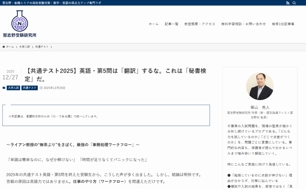 いよいよ共通テスト本番が迫ってまいりました。 当塾の専門機関「習志野受験研究所」では、昨今の難化傾向への対策として、**「2025年度 英語(第5問)」**の詳細な再分析レポートを公開しました。