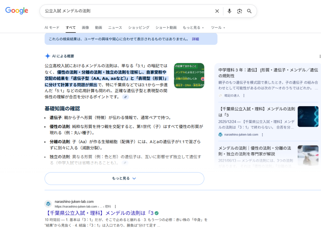 当校が運営する入試分析サイトにて、本日公開した記事「【千葉県公立入試・理科】メンデルの法則」が、公開直後に主要検索エンジンで1位を獲得しました(通算37記事目)。